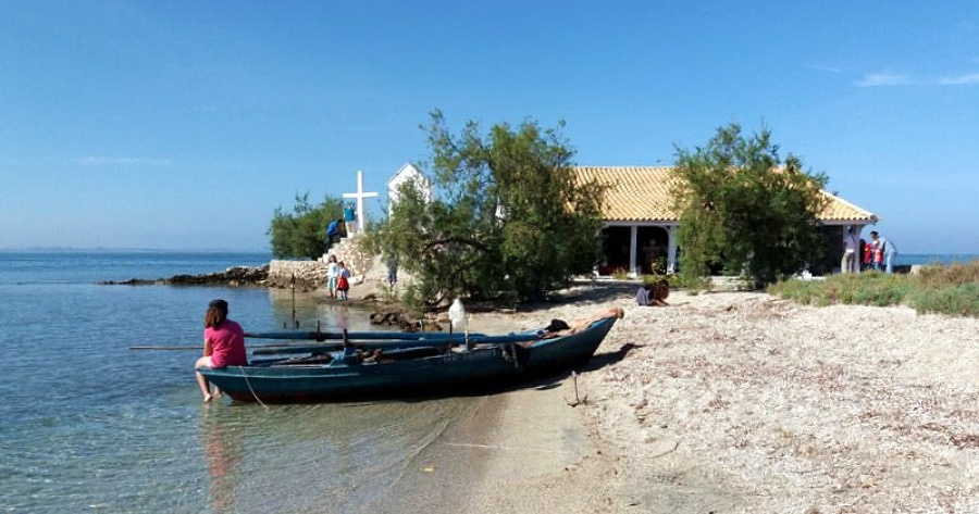 Ανάμεσα στα εκπληκτικά χρώματα που η χλωρίδα της λιμνοθάλασσας δημιουργεί, αχνοφαίνεται από το δρόμο ένα πολύ μικρό κομμάτι γης με ένα εκκλησάκι που νομίζεις ότι σε λίγο θα το καταπιεί η θάλασσα. Το ξωκλήσι, του Αγίου Νικολάου, είναι το μοναδικό κτίσμα που φιλοξενεί και αυτό από το οποίο έχει πάρει το μικροσκοπικό νησί το όνομα του. Κι όμως σε αυτό το εξωτικό σκηνικό λειτουργούσε το τελωνείο του νησιού αιώνες πριν. Το εκκλησάκι χτίστηκε στα ερείπια αρχαίου ιερού αφιερωμένου στην Αφροδίτη.