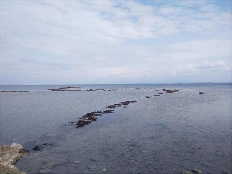 Στις φωτογραφίες διακρίνονται τα τείχη του αρχαίου λιμανιού της Κυλλήνης, το οποίο σε φυσιολογικές συνθήκες βρίσκεται υπό την επιφάνεια της θάλασσας.