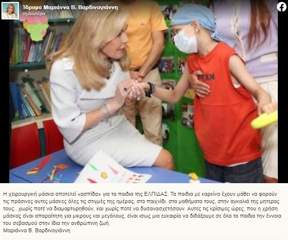 Η κα Μαριάννα Βαρδινογιάννη, έχει το δικό της μήνυμα να στείλει μέσα από τα social media. Αυτό σχετίζεται, με το πόσο απαραίτητες είναι οι μάσκες, προκειμένου να προφυλάξουμε τα παιδιά μας (σ.σ. όλα τα παιδιά) από τον τόσο επικίνδυνο και ιδιαίτερα μολυσματικό κορωνοϊό (σ.σ. Covid-19):