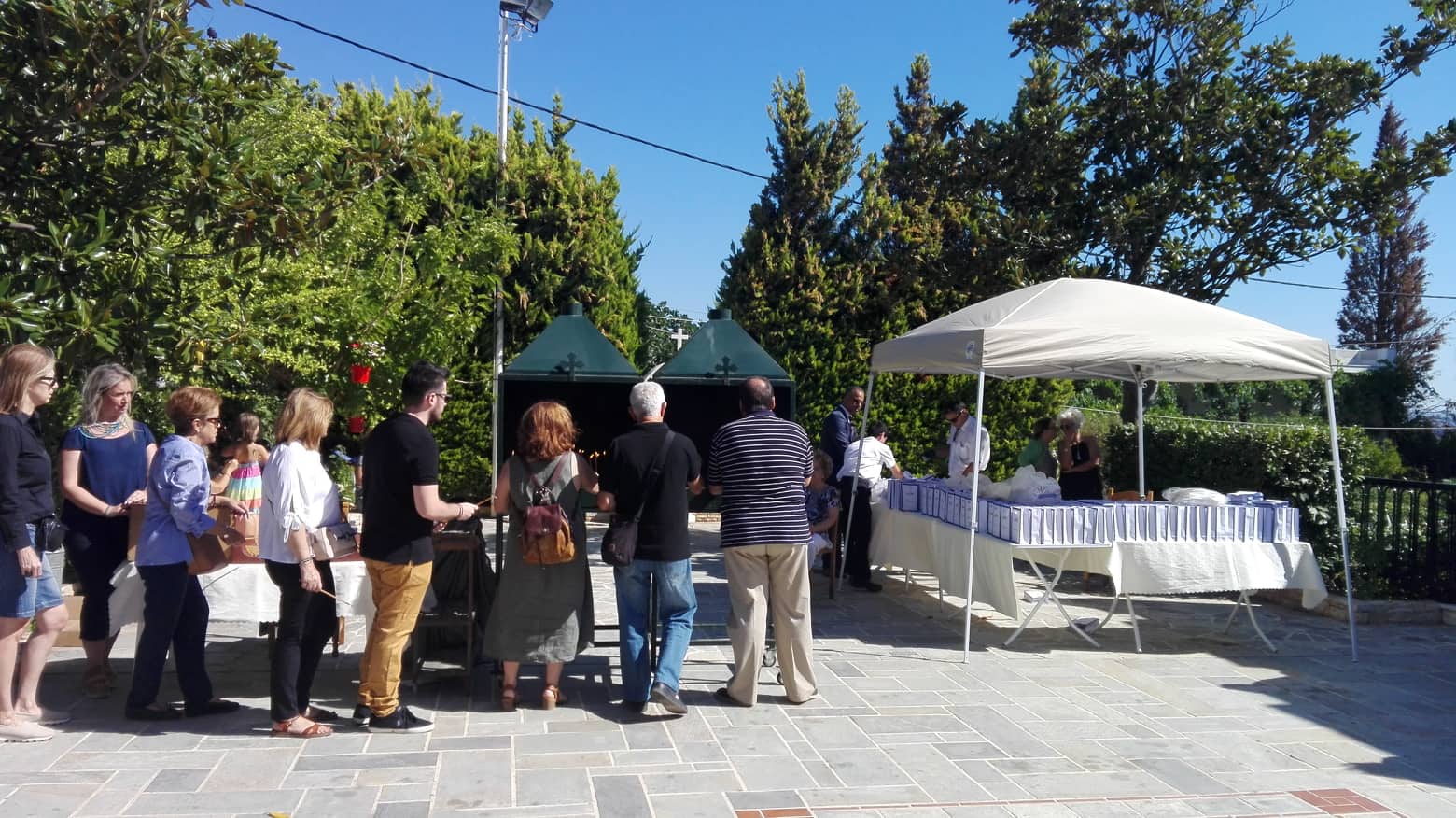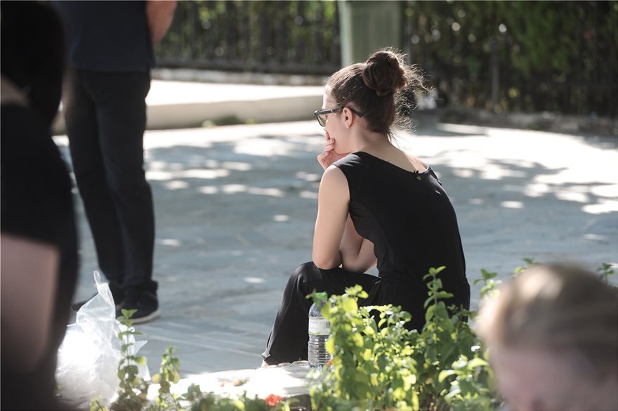 Στον προαύλιο χώρο της εκκλησίας Κοιμήσεως Θεοτόκου μαζεύτηκαν αρκετοί κάτοικοι, συγγενείς και φίλοι των θυμάτων της μεγάλης φωτιάς.