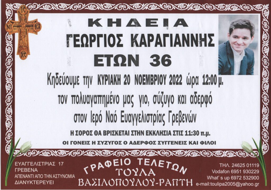 Την τελευταία του πνοή άφησε σε ηλικία μόλις 36 χρονών το Σάββατο 19 Νοεμβρίου 2022 ο διακεκριμένος Γρεβενιώτης πιανίστας, Γιώργος Καραγιάννης, νικημένος από την επάρατη νόσο.