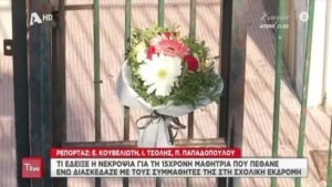 Η σχολική κοινότητα είναι βυθισμένη στη θλίψη για την απώλεια της Ιωάννας. Χθες, πήγαν στο σχολείο με μαύρα μπλουζάκια και με λουλούδια στα χέρια. Μια ανθοδέσμη για τη μνήμη της 15χρονης μαθήτριας ήταν δεμένη στην είσοδο του σχολείου. Στο σχολείο έφθασαν πέντε ψυχολόγοι, τρεις από τον δήμο και δύο από το υπουργείο Παιδείας, προκειμένου να στηρίξουν τα παιδιά να διαχειριστούν αυτό το τραγικό γεγονός.