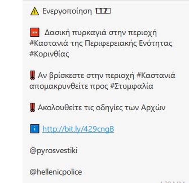 “Δασική πυρκαγιά στην περιοχή Καστανιά της Περιφερειακής Ενότητας Κορινθίας Παραμείνετε σε ετοιμότητα και ακολουθείτε τις οδηγίες των Αρχών”