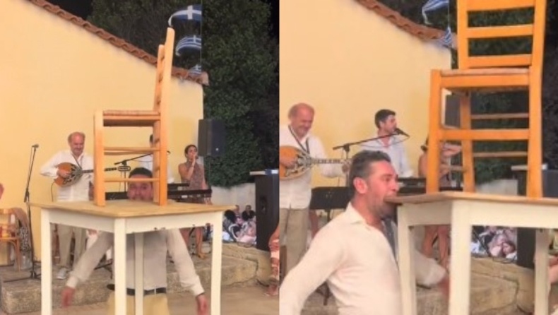 Συγκεκριμένα, στο βίντεο έχει καταγραφεί ένας άντρας να χορεύει ζεϊμπέκικο σε πανηγύρι κρατώντας με τα δόντια του ένα τραπέζι, πάνω στο οποίο είναι μια καρέκλα.