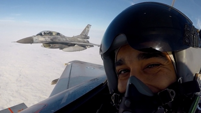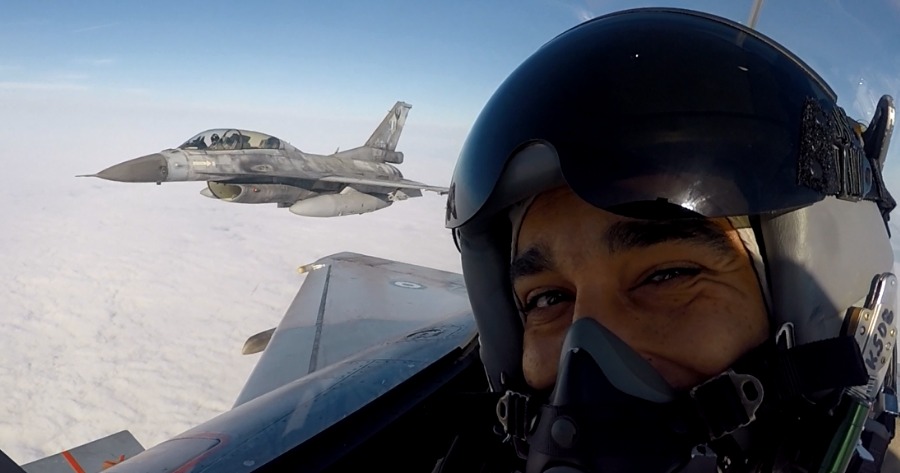 Το «φιλικό κυνηγητό» πάνω από τα σύννεφα έχει ολοκληρωθεί. Σε πολύ κοντινή απόσταση, πίσω από το δεξί φτερό του Mirage 2000-5 προσεγγίζει το «ζευγάρι» μας. Χαιρετούμε ιπποτικά τον πιλότο του F-16 και εκείνος, αφού μας ανταποδίδει τον χαιρετισμό, αποχωρεί.