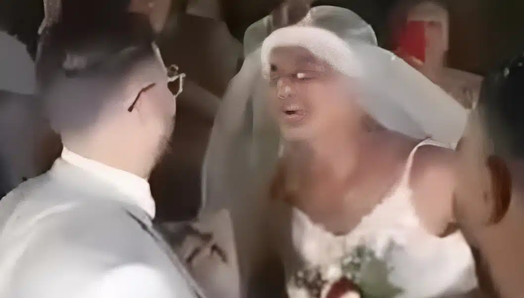 Λίγο πριν ξεκινήσει το μυστήριο, ο άνδρας έκανε την είσοδό του… ντυμένος νύφη! Φορούσε λευκό νυφικό, πέπλο, κρατούσε ανθοδέσμη και περπατούσε με χάρη, μιμούμενος την πραγματική νύφη, η οποία εκείνη την ώρα ετοιμαζόταν να κάνει την παραδοσιακή της είσοδο. Η απρόσμενη αυτή εμφάνιση προκάλεσε ξέσπασμα γέλιου και παρατεταμένα χειροκροτήματα από τους καλεσμένους, οι οποίοι δεν μπορούσαν να πιστέψουν αυτό που έβλεπαν.