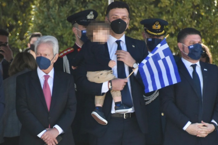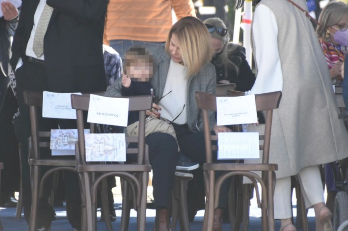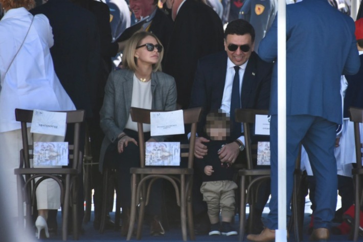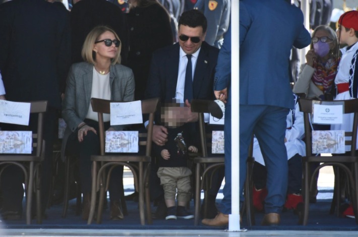Ο κ. Κικίλιας βρίσκεται στους επίσημους κρατώντας στην αγκαλιά του τον ενός έτους γιο του Παναγιώτη Αντώνιο, ενώ στο πλευρό του βρίσκεται διακριτικά η σύζυγός του και παρουσιάστρια Τζένη Μπαλατσινού.