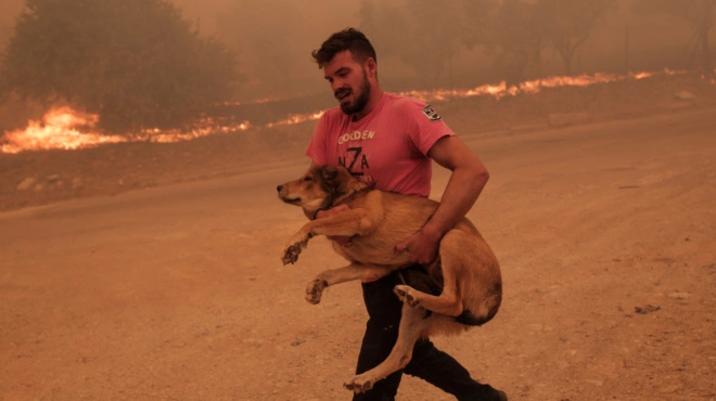 Ο εν λόγω κάτοικος έχει στην αγκαλιά του έναν σκύλο, ενώ προσπαθεί να απομακρύνει από το σημείο της φωτιάς έναν γάιδαρο και ένα άλογο.