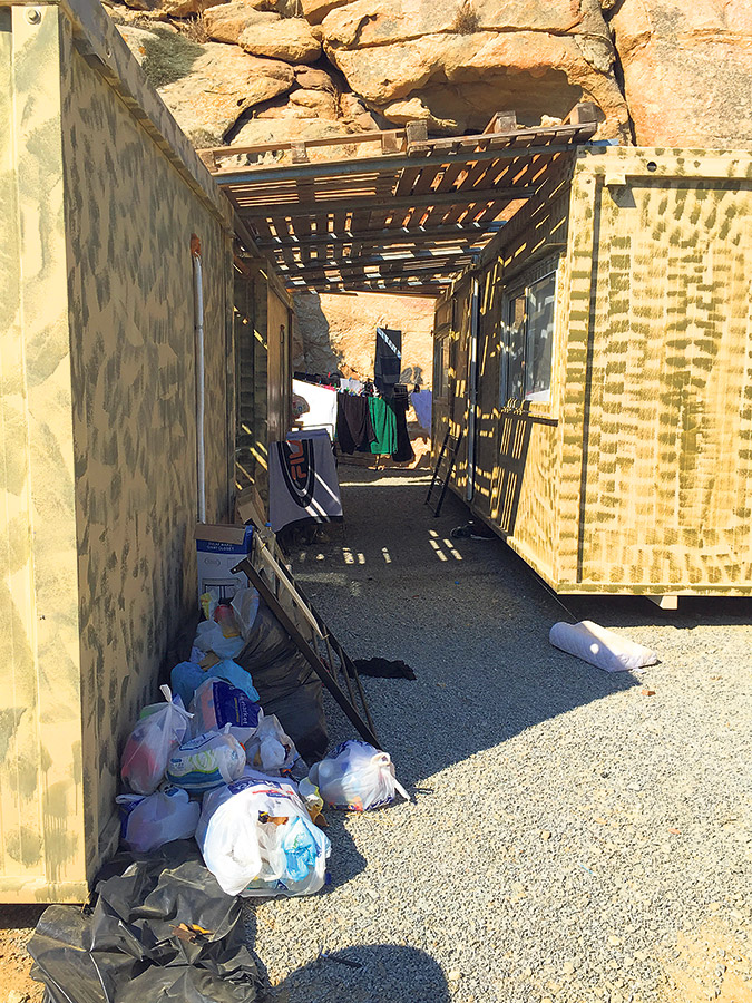 Μια εικόνα παραγκούπολης, μιας και δεν διαφέρει και πολύ ένα κοντέινερ από μια παράγκα. Ειδικά όταν και τα δύο βρίσκονται εκτεθειμένα στις καιρικές συνθήκες. Μέσα σε κοντέινερ στοιβάζουν τους εκατοντάδες Έλληνες εργαζόμενους σε beach bars. Είναι μια τακτική που ακολουθούν δεκάδες επιχειρήσεις στο Νησί των Ανέμων.