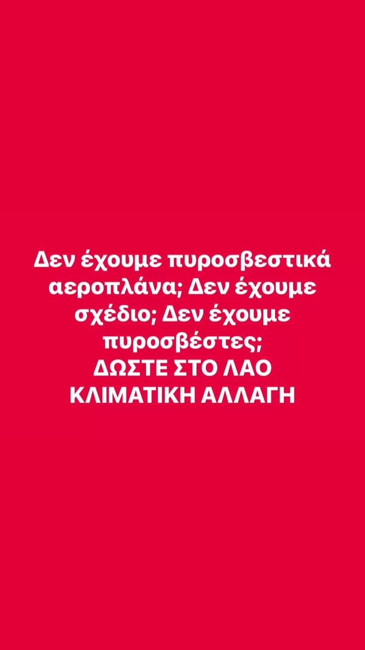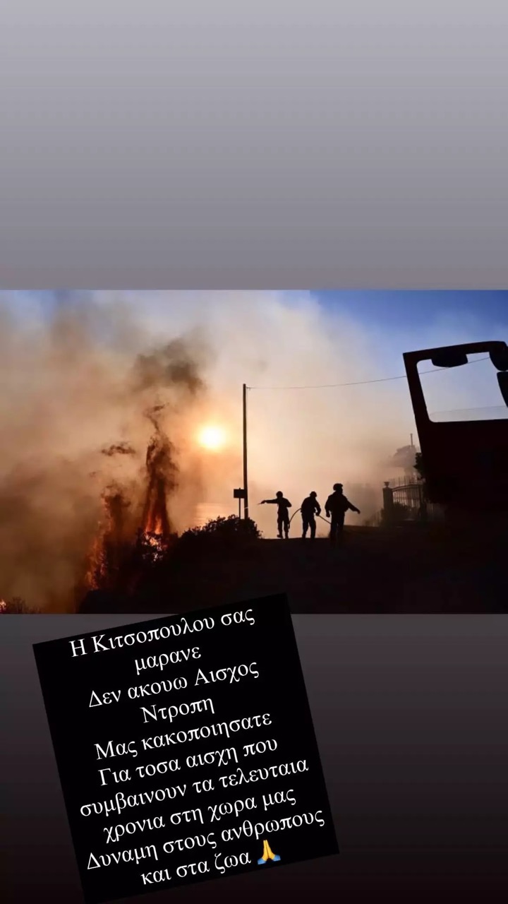 «Η Κιτσοπούλου μας μάρανε. Δεν ακούω “αίσχος, ντροπή”. Μας κακοποιήσατε. Για τόσα αίσχη που συμβαίνουν τα τελευταία χρόνια στη χώρα μας. Δύναμη στους ανθρώπους και στα ζώα. Δεν έχουμε πυροσβεστικά αεροπλάνα; Δεν έχουμε σχέδιο; Δεν έχουμε πυροσβέστες; Δώστε στον λαό κλιματική αλλαγή» έγραψε στην ανάρτησή του ο Θανάσης Αλευράς.