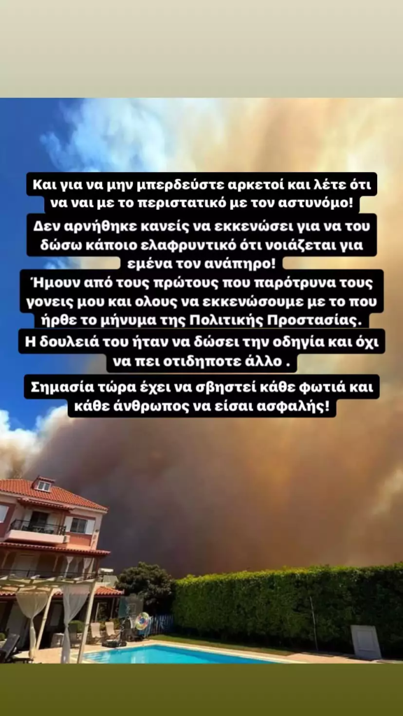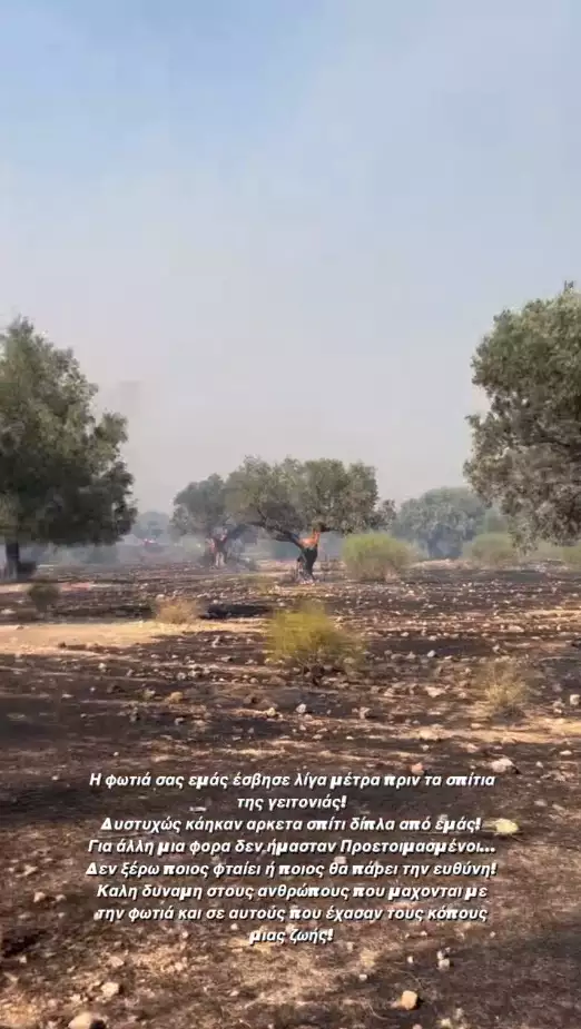 «Δυστυχώς κάηκαν αρκετά σπίτια δίπλα από εμάς! Για άλλη μια φορά δεν ήμασταν προετοιμασμένοι… Δεν ξέρω ποιος φταίει ή ποιος θα πάρει την ευθύνη! Καλή δύναμη στους ανθρώπους που μάχονται με τη φωτιά και σε αυτούς που έχασαν τους κόπους μιας ζωής!