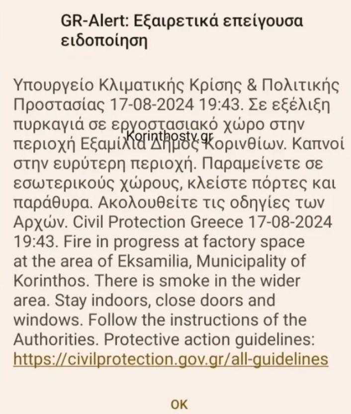 «Υπουργείο Κλιματικής Κρίσης & Πολιτικής Προστασίας 17-08-2024 19:43. Σε εξέλιξη πυρκαγιά σε εργοστασιακό χώρο στην περιοχή Εξαμίλια Δήμος Κορινθίων. Καπνοί στην ευρύτερη περιοχή. Παραμείνετε σε εσωτερικούς χώρους, κλείστε πόρτες και παράθυρα. Ακολουθείτε τις οδηγίες των Αρχών», αναφέρει το μήνυμα.