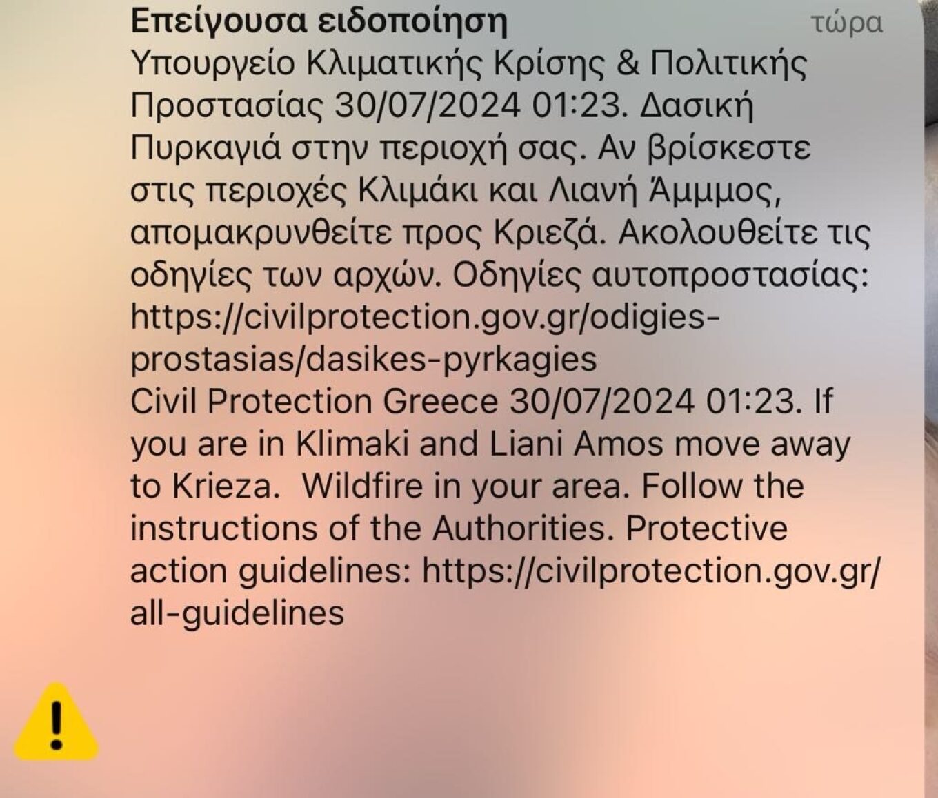 Επισημαίνεται ότι, λίγο μετά την 01:20 τα ξημερώματα της Τρίτης, εστάλη εκ νέου μήνυμα μέσω του αριθμού έκτακτης ανάγκης 112. Το μήνυμα αυτό απευθυνόταν στους κατοίκους που διαμένουν στις περιοχές Κλιμάκι και Λιανή Άμμο, τους οποίους καλούσε να προβούν άμεσα στην απομάκρυνσή τους προς την κατεύθυνση των Κριεζά, προκειμένου να διασφαλιστεί η ασφάλεια τους λόγω της συνεχιζόμενης πυρκαγιάς.