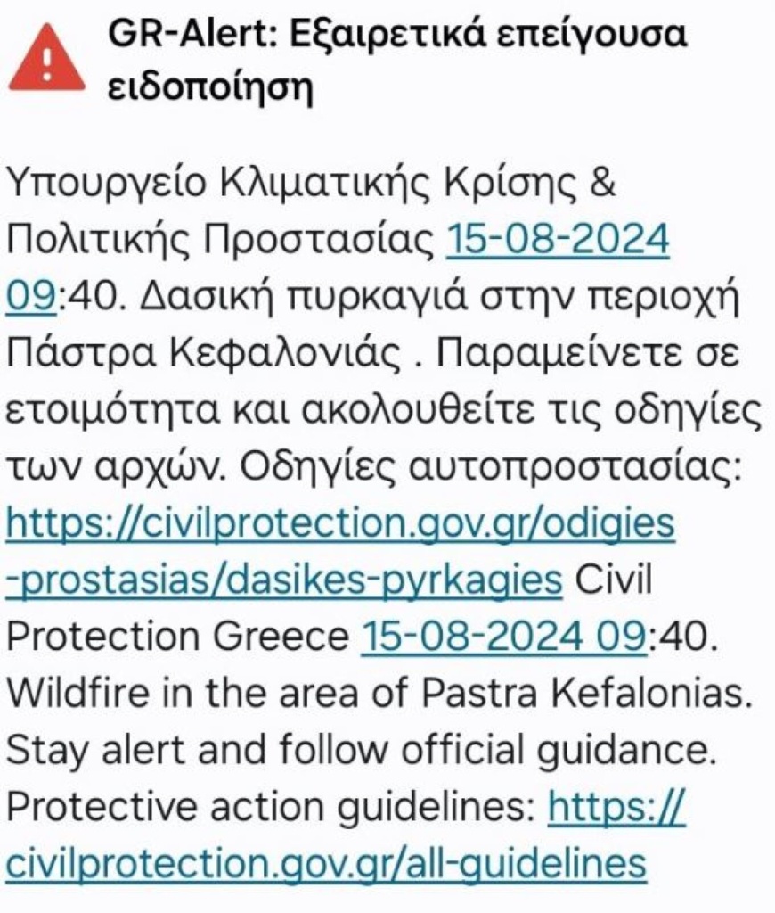 «Δασική πυρκαγιά στην περιοχή Πάστρα Κεφαλονιάς. Παραμείνετε σε ετοιμότητα και ακολουθήστε τις οδηγίες των αρχών», έγραφε το μήνυμα.