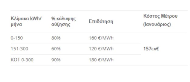 - Για μηνιαία κατανάλωση από 151-300 KWh επιδοτείται το 60% της αύξησης με 120 MWh.