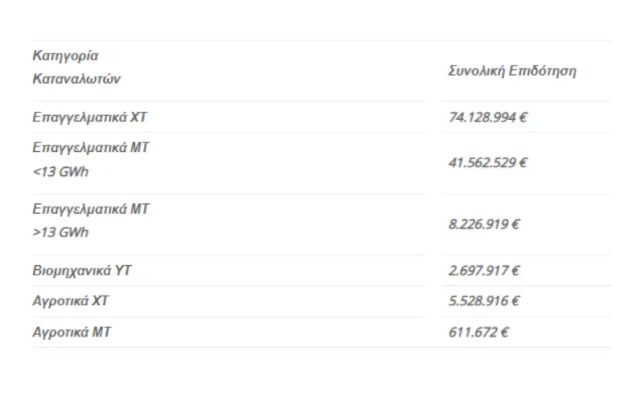 - Θα επιδοτηθούν οριζόντια όλα τα μη οικιακά τιμολόγια αγροτικά, εμπορικά, βιομηχανικά, επαγγελματικά και λοιπών χρήσεων, ανεξαρτήτως μεγέθους και επιπέδου τάσης, ανεξαρτήτως δηλαδή εάν οι επιχειρήσεις είναι συνδεδεμένες στη χαμηλή, τη μέση ή την υψηλή τάση.