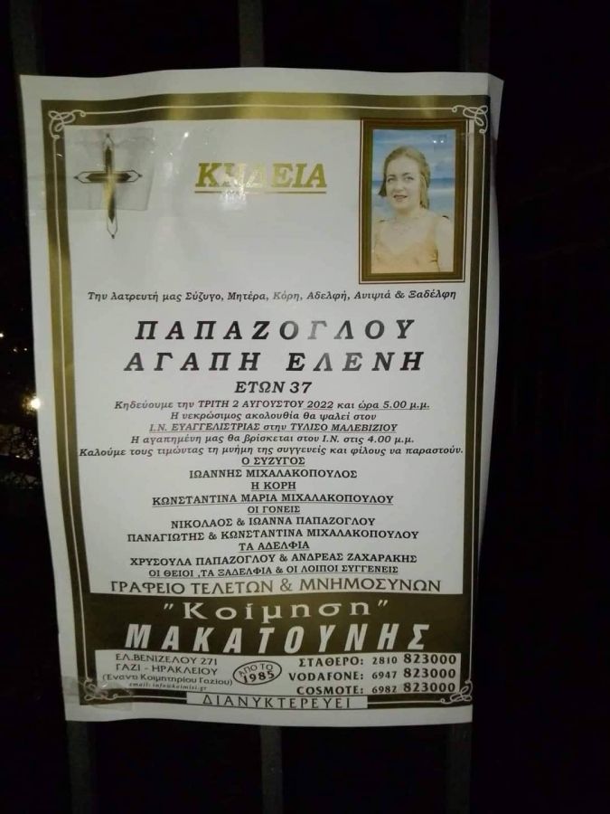 Η κηδεία της Αγάπης Παπάζογλου, που ήταν παντρεμένη και μητέρα ενός ανήλικου παιδιού, θα γίνει την Τρίτη στις 5 στον Ι.Ν. Ευαγγελίστριας στην Τύλισο.