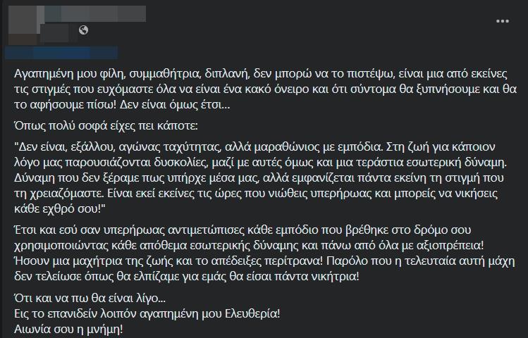 Σε αναρτήσεις στα Μέσα κοινωνικής δικτύωσης φίλοι της 25χρονης μιλάνε για έναν άνθρωπο χαμογελαστό, δυνατό και ντόμπρο.