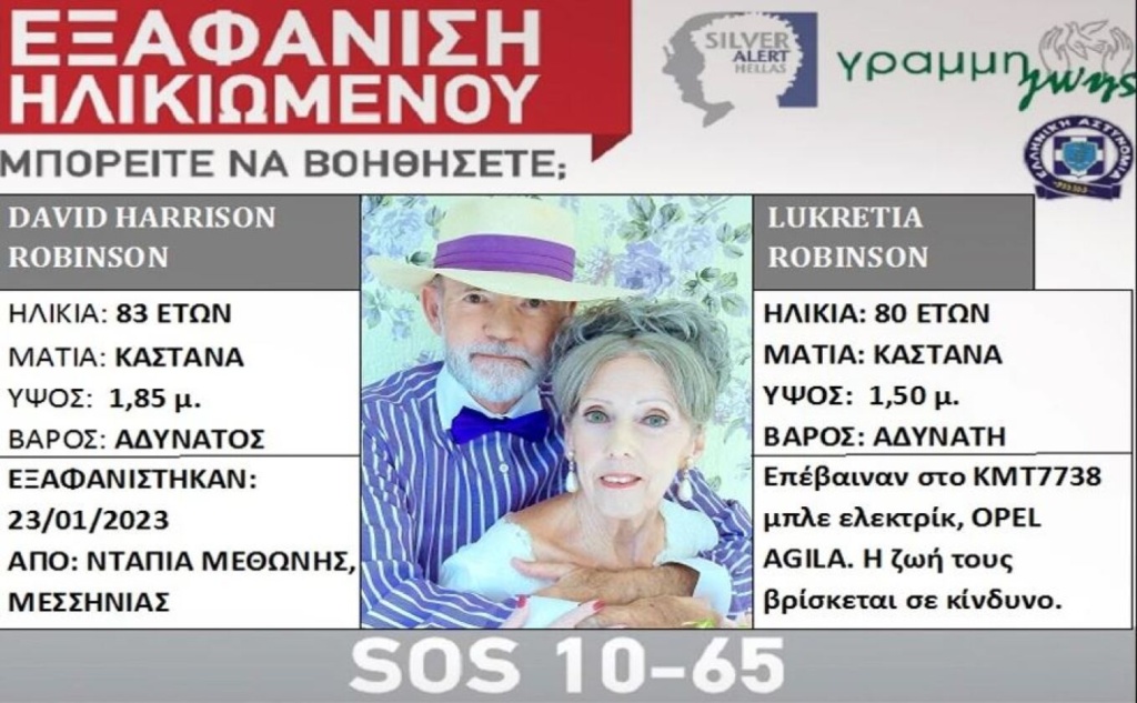 Πρόκειται για τον David Harrison Robinson, 83 ετών και τη σύζυγό του, Lukretia Robinson, 80 ετών, οι οποίοι εξαφανίστηκαν από το σπίτι τους, στην περιοχή Ντάπια Μεθώνης, του δήμου Πύλου Νέστορος στην Μεσσηνία, με το αυτοκίνητό τους μάρκας OPEL AGILA DIESEL 1300, μοντέλο 2009, χρώματος μπλε ελεκτρίκ, με αριθμό κυκλοφορίας ΚΜΤ7738.