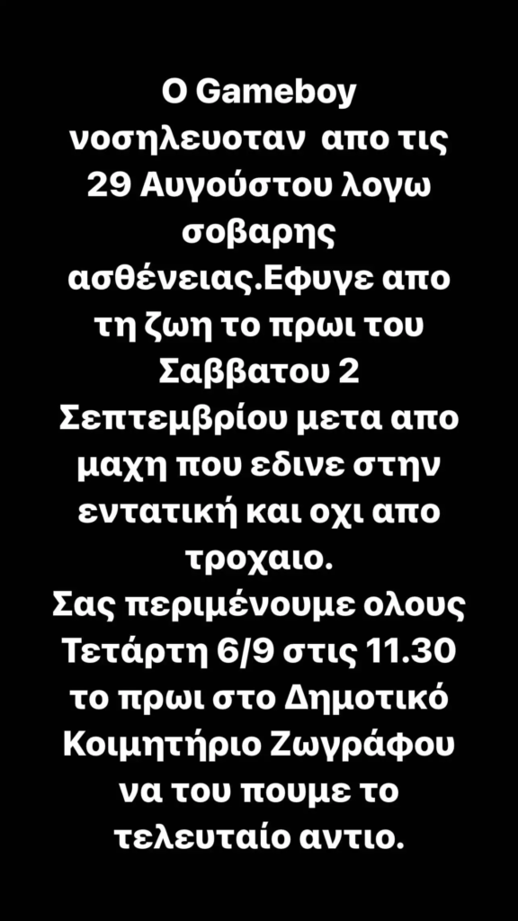 Μέσα από τον επίσημο λογαριασμό του στο Instagram, ο Snik θέλησε να αποχαιρετήσει τον «αδελφό» του γράφοντας χαρακτηριστικά: «Αναπαύσου εν ειρήνη αδελφέ μου». Στη συνέχεια, γνωστοποίησε ότι η κηδεία του Gameboy Melody θα πραγματοποιηθεί την Τετάρτη 6 Σεπτεμβρίου στις 11.30 το πρωί στο Δημοτικό Κοιμητήριο Ζωγράφου.