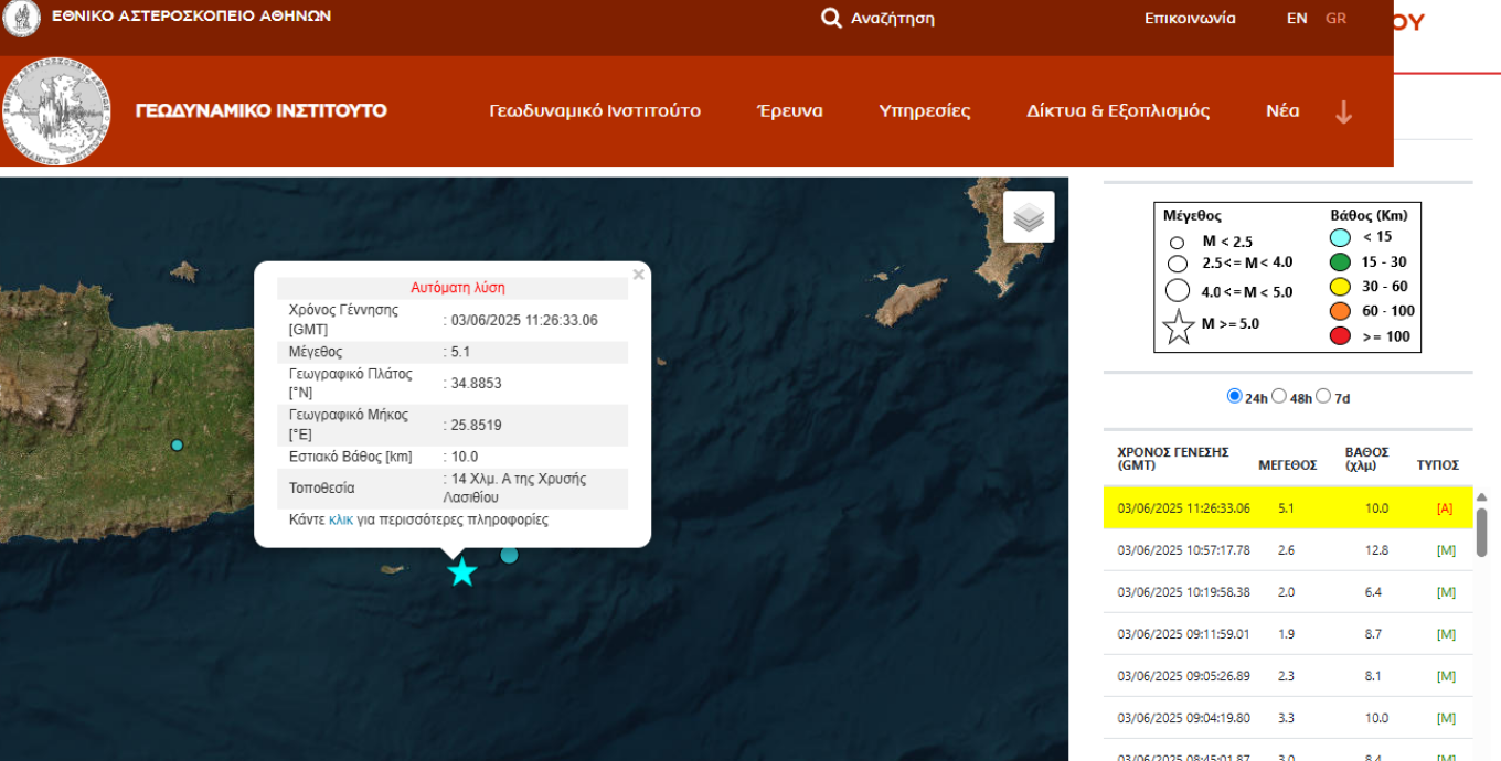 Σεισμική δόνηση μεγέθους 5,3 Ρίχτερ σημειώθηκε ανοιχτά του Λασιθίου στην Κρήτη, με το επίκεντρο να εντοπίζεται στη θαλάσσια περιοχή ανατολικά του νησιού.
