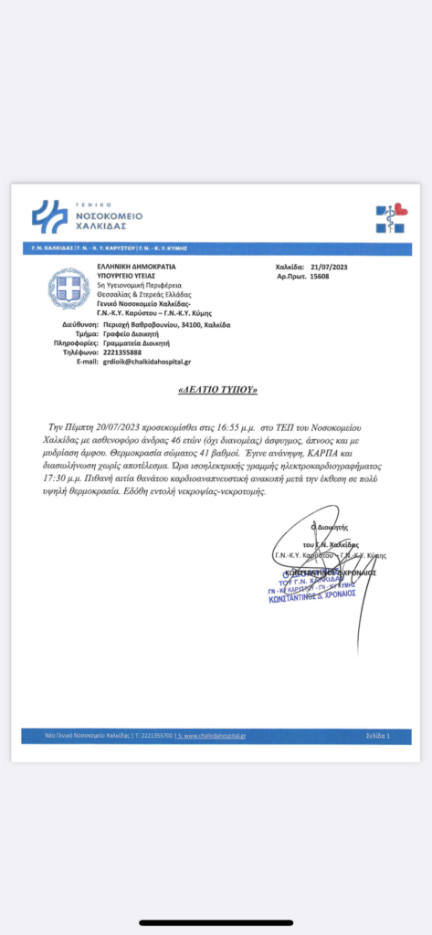 Το θύμα εισήχθη στο Γενικό Νοσοκομείο Χαλκίδας, όπου διαπιστώθηκε ότι πρόκειται για θερμοπληξία, αλλά, παρά τις προσπάθειες, κατέληξε.