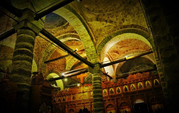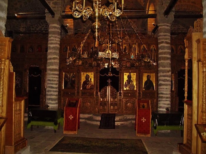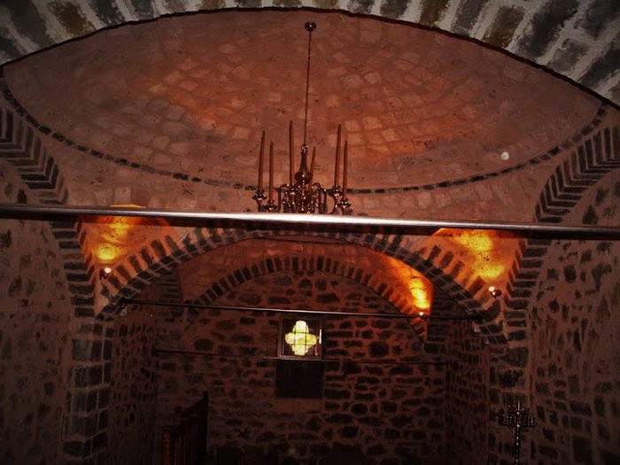 Μπαίνοντας κανείς στο εσωτερικό του θα παρατηρήσει ότι είναι αρκετά σκοτεινός με λίγο φως που μπαίνει από τα μικρά παραθυράκια τον τρούλων.