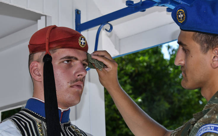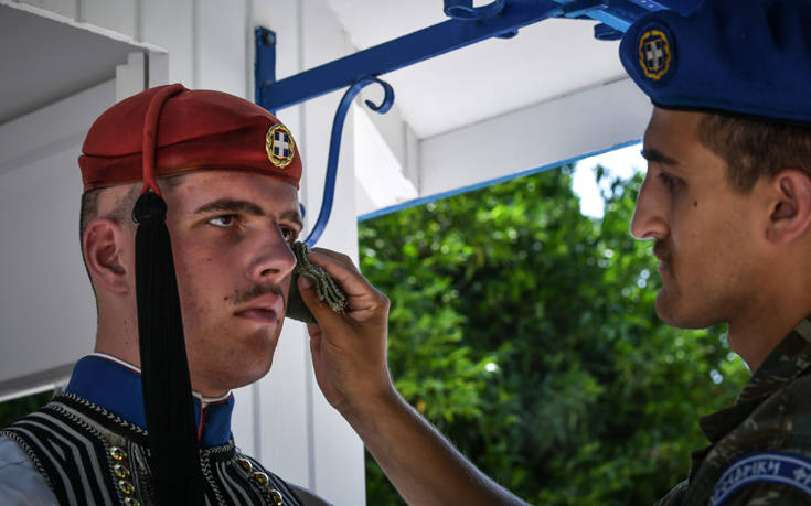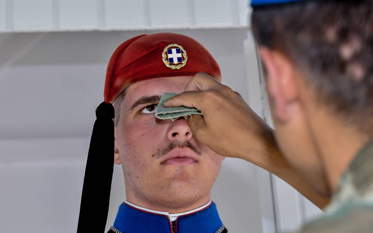 Δύσκολη είναι η κατάσταση και για τους εύζωνες μπροστά από τη Βουλή που αναγκάζονται να παραμένουν όρθιοι σε συνθήκες καύσωνα.