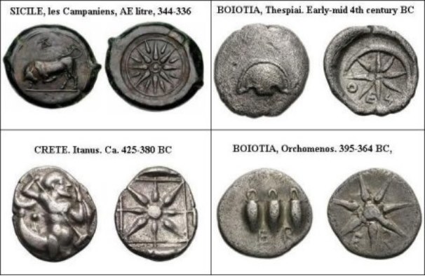 Δεκαεξάστεροι και Οχτάστεροι Ήλιοι παρουσιάζονται συχνά σε Ελληνιστικά νομίσματα και ασπίδες της Περιόδου. Επίσης υπαρχει και αριθμός απεικονίσεων Αθηναίων Οπλιτών να φέρουν ένα πανομοιότυπο δεκαεξάκτινο σύμβολο στη πανοπλία τους, απο τον 6ο π.Χ. αιώνα ,καθώς και σε νομίσματα, από τη νησιωτική μέχρι την ηπειρωτική Ελλάδα, όπως στη Κέρκυρα, εύρημα 5ου π.Χ. αιώνα, Λοκρίδα, 4ο π.Χ. αιώνα.