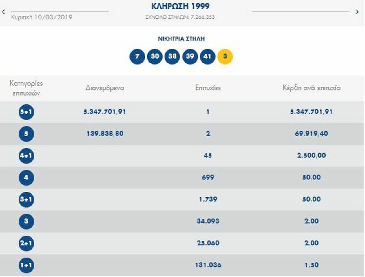 Το ποσό που θα μοιραστούν οι τυχεροί της 1ης κατηγορίας στην επόμενη κλήρωση της Πέμπτης 14/03/2019 είναι 600.000 ευρώ τουλάχιστον.