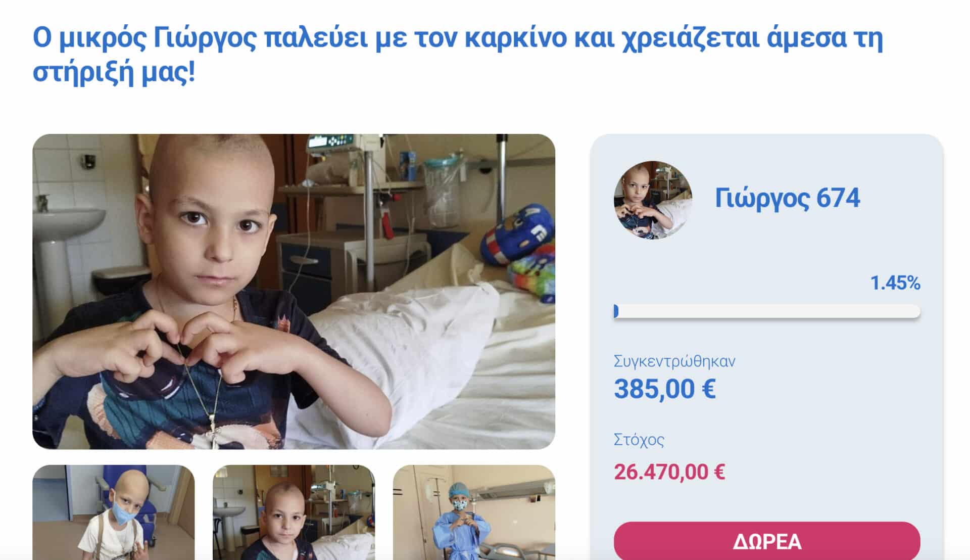 Ο Γιώργος είναι ένα 6χρονο αγγελούδι που καλείται να δώσει τη μεγαλύτερη μάχη της ζωής του, αφού διαγνώστηκε πριν από ενάμιση περίπου χρόνο με νευροβλάστωμα 4ου σταδίου στο δεξί επινεφρίδιο.