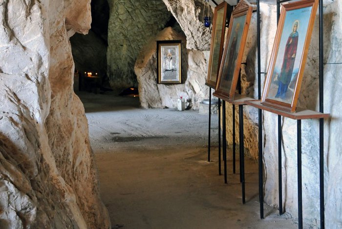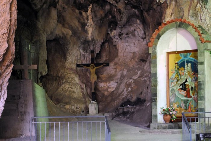 Την σπηλιά δε όπου είναι κτισμένη η εκκλησία, την χρησιμοποιούσαν ως καταφύγιο και κρυφό σχολειό τα χρόνια της Τουρκοκρατίας. Αυτό που σεβάστηκε όμως, ο Γερμανός κατακτητής, δεν σεβάστηκαν οι Έλληνες στις μέρες μας και έτσι, δυστυχώς, ο γέρο-πλάτανος δεν υπάρχει πια. Οι εργασίες στον περιβάλλοντα χώρο του ναού συνεχίζονται ακόμα και σήμερα. Μέσα στο σπήλαιο, βάθους 110 μέτρων, έχει κτιστεί ένα προσκύνημα ονομαζόμενο Γολγοθάς.