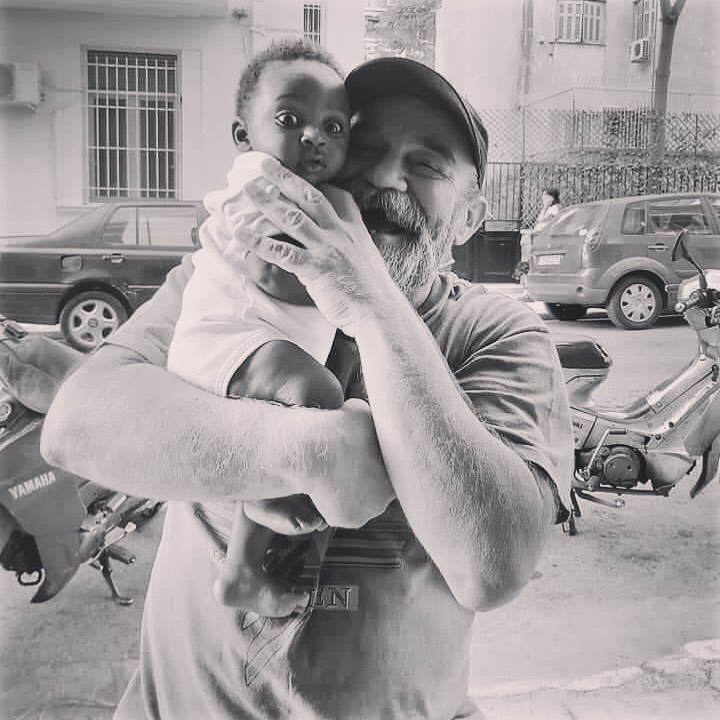 Αυτή η φωτογραφία που βλέπεις είναι από την Μυτιλήνη, από την Σκάλα Συκαμιάς, εκεί μαγείρευα για τους πρόσφυγες. Κάποια μέρα είδαμε μια ομάδα ανθρώπων σε μια βάρκα που πλησίαζε την ακτή, όταν ξαφνικά χάλασε η μηχανή. Τότε, κάποιος μου έδωσε ένα κουπί και προσπαθήσαμε όλοι μαζί να βγάλουμε την βάρκα με τους ανθρώπους έξω. Αυτό το κουπί το κράτησα, το έχω ονομάσει κουπί της ελπίδας και το χρησιμοποιώ κανονικά σαν κουτάλα για να μαγειρεύω. Και σε αυτή την φωτογραφία είναι η γιαγιά με το παιδί που αγκαλιάστηκαν και έκλαιγαν με λυγμούς γιατί μόλις είχαν σωθεί.