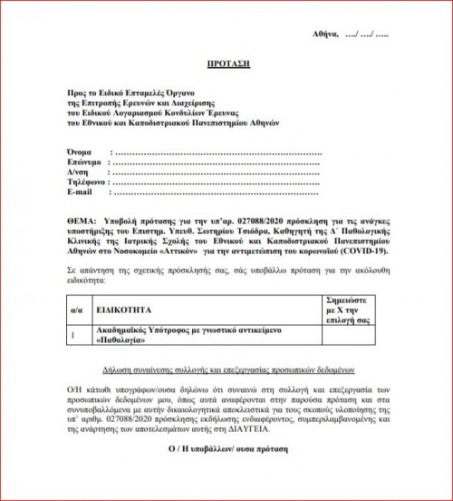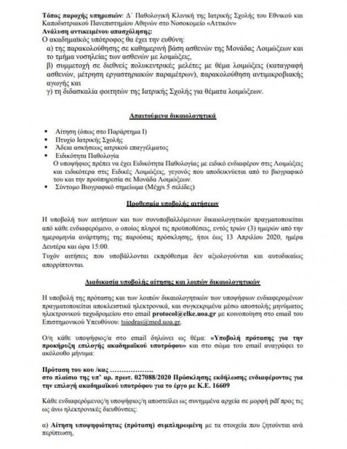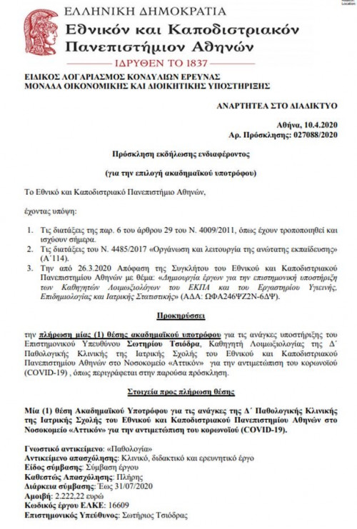O Έλληνας λοιμωξιολόγος αναζητά βοηθό και όχι άδικα. Έτσι, το Εθνικό και Καποδιστριακό Πανεπιστήμιο Αθηνών προκήρυξε την πλήρωση μίας θέσης ακαδημαϊκού υποτρόφου. Όπως αναφέρεται στην προκήρυξη, πρόκειται «για τις ανάγκες υποστήριξης του Επιστημονικού Υπευθύνου Σωτηρίου Τσιόδρα, Καθηγητή Λοιμωξιολογίας της Δ΄ Παθολογικής Κλινικής της Ιατρικής Σχολής του Εθνικού και Καποδιστριακού Πανεπιστημίου Αθηνών στο Νοσοκομείο «Αττικόν» για την αντιμετώπιση του κορωνοϊού (COVID-19)».