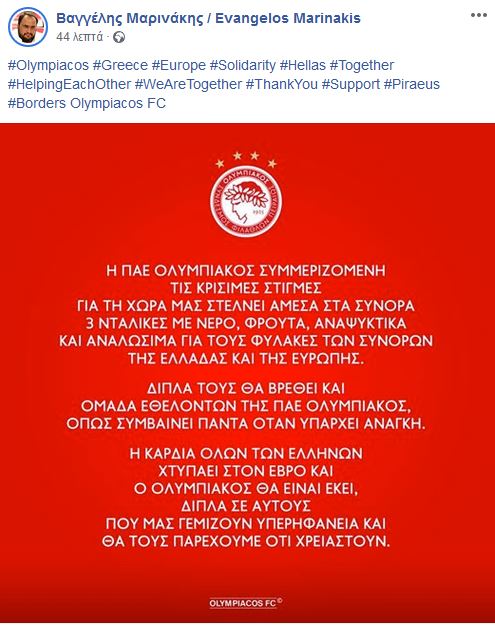 «Η ΠΑΕ ΟΛΥΜΠΙΑΚΟΣ συμμεριζόμενη τις κρίσιμες στιγμές για τη χώρα μας στέλνει άμεσα στα σύνορα 3 νταλίκες με νερό, φρούτα, αναψυκτικά, και αναλώσιμα για τους φύλακες των συνόρων της Ελλάδας και της Ευρώπης.