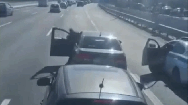 Στη συνέχεια ο οδηγός πηδάει τα κιγκλιδώματα, κατευθύνεται προς το αυτοκίνητό του απομακρύνεται από το σημείο.