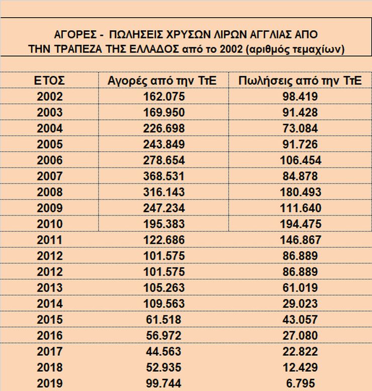 Σύμφωνα με τα επίσημα στοιχεία της Τράπεζας της Ελλάδος, οι πωλήσεις χρυσών λιρών Αγγλίας, από πολίτες στην κεντρική τράπεζα της χώρας, άγγιξαν τις 100.000 τεμάχια το 2019. Ειδικότερα, όπως προκύπτει από τον σχετικό πίνακα, το 2019 ρευστοποιήθηκαν στην ΤτΕ 99.744 χρυσές λίρες Αγγλίας, όταν το 2018 είχαν πωληθεί 52.935 λίρες.