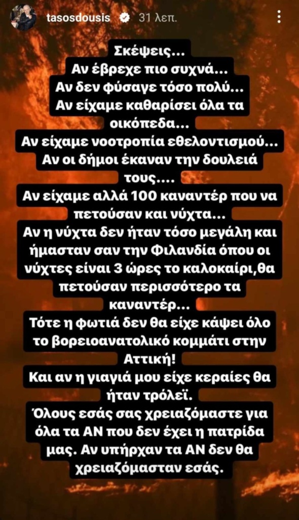 «Έξω από τα δόντια» μίλησε για ακόμα μια φορά ο Τάσος Δούσης, ο οποίος πήρε ανοιχτή θέση για τις πυρκαγιές που ξεσπούν στη χώρα, με αφορμή το πύρινο μέτωπο στην Αττική. Ο εκδότης και δημοσιογράφος, με μια ανάρτησή του στα μέσα κοινωνικής δικτύωσης, έδωσε τροφή για σκέψη αναφορικά με τις φωτιές που κάθε χρόνο ταλανίζουν την Ελλάδα.