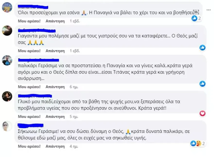 Χαρακτηριστικά είναι τα δεκάδες μηνύματα που δέχεται στο προφίλ του στο facebook, με ευχές να καταφέρει να βγει υγιής από αυτή τη δύσκολη μάχη.
