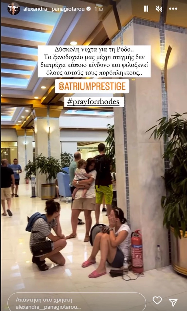 «Δύσκολη νύχτα για τη Ρόδο. Το ξενοδοχείο μας μέχρι στιγμής δεν διατρέχει κάποιο κίνδυνο και φιλοξενεί όλους αυτούς τους πυρόπληκτους», γράφει συνοδευτικά με το βίντεο η Αλεξάνδρα Παναγιώταρου.