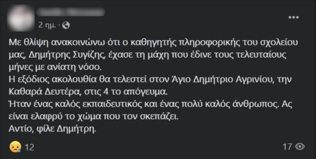 Με θλίψη ανακοινώνω ότι ο καθηγητής πληροφορικής του σχολείου μας, Δημήτρης Συγίζης, έχασε τη μάχη που έδινε τους τελευταίους μήνες με ανίατη νόσο.