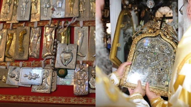Η εικόνα της Παναγίας της Τήνου, για την οποία επισκέπτονται το νησί πιστοί από όλα τα μέρη της Ελλάδας, είναι κρυμμένη πίσω από τα τάματα και δεν φαίνεται.