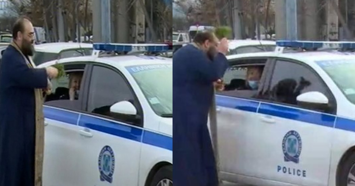 Την Θεία Λειτουργία διέκοψε ο ιερέας στον Άγιο Πολύκαρπο στην Θεσσαλονίκη. Το έκανε, προκειμένου να ραντίσει τα περιπολικά της ΕΛΑΣ που περιπολούσαν απ’ έξω. Μάλιστα, οι αστυνομικοί άνοιξαν τις πόρτες των οχημάτων, για να πάει ο αγιασμός και στο εσωτερικό τους,. Επιπλέον, μία γυναίκα από το Σώμα, δεν δίστασε να κατεβάσει την μάσκα της. Το έκανε για να φιλήσει το χέρι του παπά.