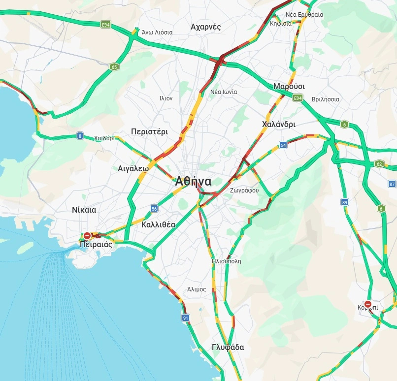 Όπως φαίνεται και στον παρακάτω χάρτη, στο «κόκκινο» βρίσκεται η εθνική οδός από τη Νέα Ερυθραία έως και τον κόμβο Μεταμόρφωσης, η Κηφισίας από την Κατεχάκη έως το Χαλάνδρι, και η Μεσογείων στο ύψος της Αγίας Παρασκευής.
