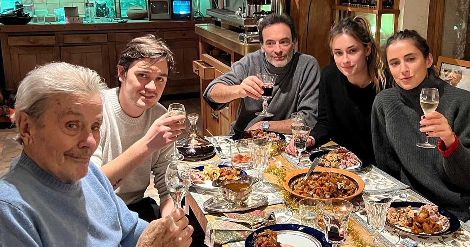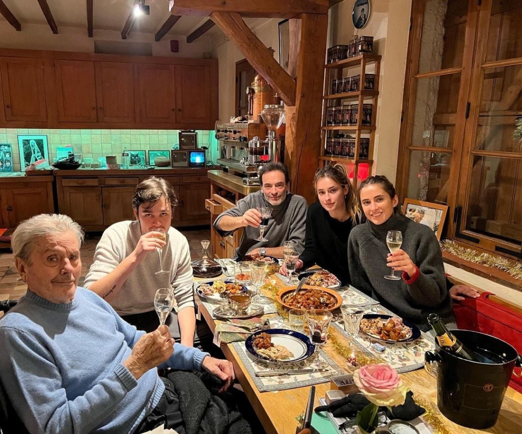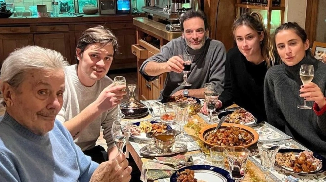 Ολοι μαζί τρώνε για τα Χριστούγεννα και υψώνουν τα ποτήρια τους για να ευχηθούν χρόνια πολλά στους θαυμαστές του 88χρονου Αλέν Ντελόν. Σημειώνουμε ότι από την οικογενειακή φωτογραφία λείπει η κόρη του Αλέν Ντελόν, Ανούσκα.