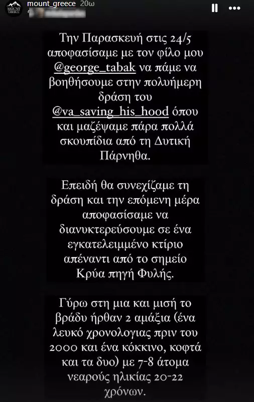 Όπως περιγράφουν σε story στο Instagram οι εθελοντές που συμμετείχαν στη δράση VA Saving his Hood, αφού μάζεψαν αρκετά σκουπίδια από τη Δυτική Πάρνηθα, αποφάσισαν να διανυκτερεύσουν σε ένα εγκαταλελειμμένο κτίριο κοντά στο δάσος απέναντι από το σημείο Κρύα Πηγή στη Φυλής.