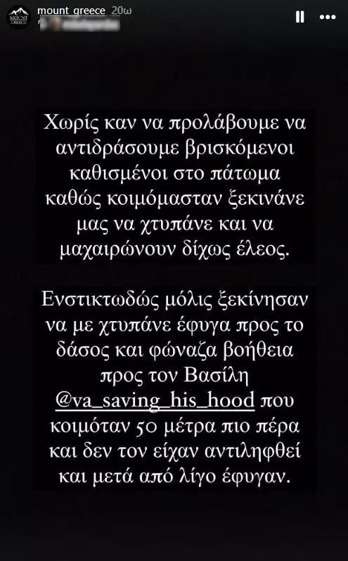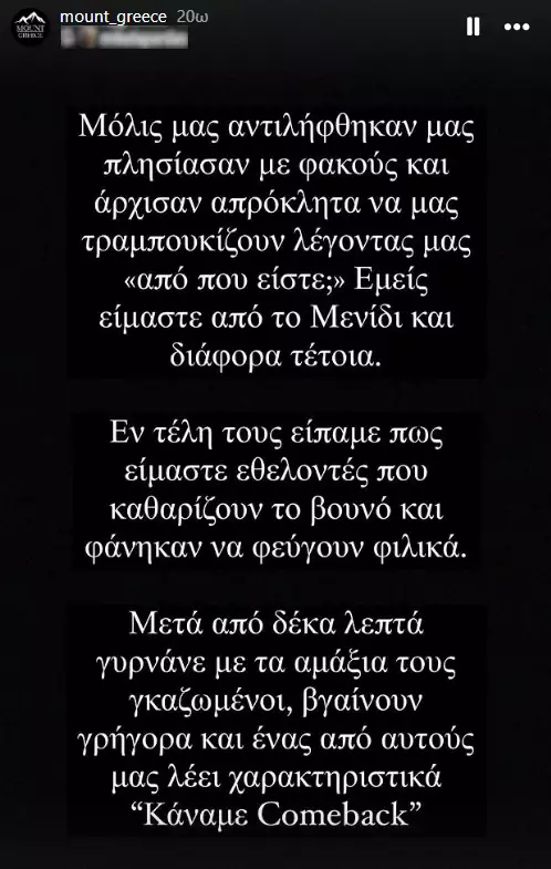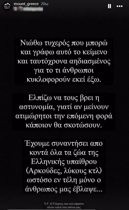 Μάλιστα, το story καταλήγει: «Έχουμε συναντήσει από κοντά όλα τα ζώα της ελληνικής υπαίθρου (αρκούδες, λύκους κτλ) ωστόσο εν τέλει μόνο ο άνθρωπος μας έβλαψε».
