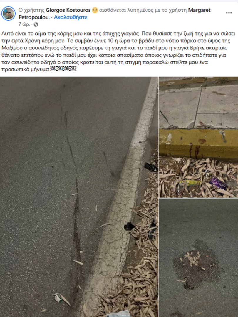 Εν τω μεταξύ με ανάρτησή του στο Facebook ο πατέρας γράφει χαρακτηριστικά, συνοδεύοντάς την και με φωτογραφίες από το σημείο «αυτό είναι το αίμα της κόρης μου». Όπως γράφει, για την ηλικιωμένη «θυσίασε την ζωή της για να σώσει την εφτάχρόνη κόρη μου. Το συμβάν έγινε 10 η ώρα το βράδυ στο νότιο πάρκο στο ύψος της Μαξίμου ο ασυνείδητος οδηγός παρέσυρε τη γιαγιά και το παιδί μου. Η γιαγιά βρήκε ακαριαίο θάνατο επιτόπου ενώ το παιδί μου έχει κάποια σπασίματα. Όποιος γνωρίζει το οτιδήποτε για τον ασυνείδητο οδηγό ο οποίος κρατείται αυτή τη στιγμή παρακαλώ στείλτε μου ένα προσωπικό μήνυμα».
