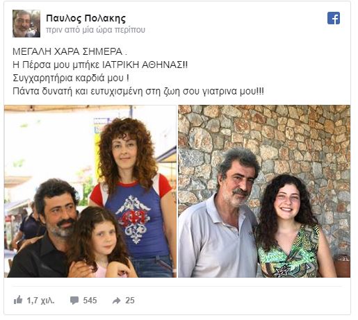 Ο πρώην υφυπουργός Υγείας της κυβέρνησης του ΣΥΡΙΖΑ προχώρησε σε σχετική ανάρτηση στο Facebook. Ο Παύλος Πολάκης ανέφερε πως η χαρά του ήταν μεγάλη. Αυτό, διότι η κόρη του, η Πέρσα, κατάφερε να περάσει στο Πανεπιστήμιο. Μάλιστα, όχι σε οποιοδήποτε Πανεπιστήμιο, αλλά σε εκείνο των Αθηνών.