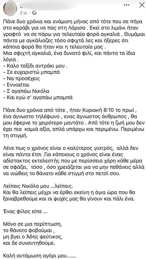 «Πάνε δυο χρόνια και ενάμιση μήνας από τότε που σε πήγα στο καράβι για να πας στη Λάρισα. Εκεί στο λιμάνι ήταν γραφτό να σε πάρω για τελευταία φορά αγκαλιά . Θυμάμαι πάντα με αγκάλιαζες τόσο σφιχτά λες και ήξερες ότι κάποια φορά θα ήταν και η τελευταία μας. Μια σφιχτή αγκαλιά, ένα δυνατό φιλί, και πάντα τα ίδια λόγια. – Καλο ταξίδι αντράκι μου.